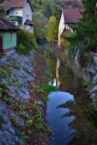 Besétáltunk a faluba is, ahol megállt az idő, az a bizonyos boldog békeidő. Szép, régi házak sorakoznak a patak partján, a pici terecskén templom áll, a szűk utcákon egy-egy ráérős járókelő nézegetett le a vízpart felé és fel a hegyek felé, csend és békés nyugalom mindenfelé. Álltam a kis hídon és azt képzeltem, hogy sétapálcás urak jönnek mindjárt, a sétapálcájuk koppan majd a macskaköveken és hogy a sarkon mindjárt befordul a hintó a grófkisasszonnyal, aki véletlenül le fogja ejteni a hímzett keszkenőjét és hárman is odatoppannak majd, hogy felvegyék.